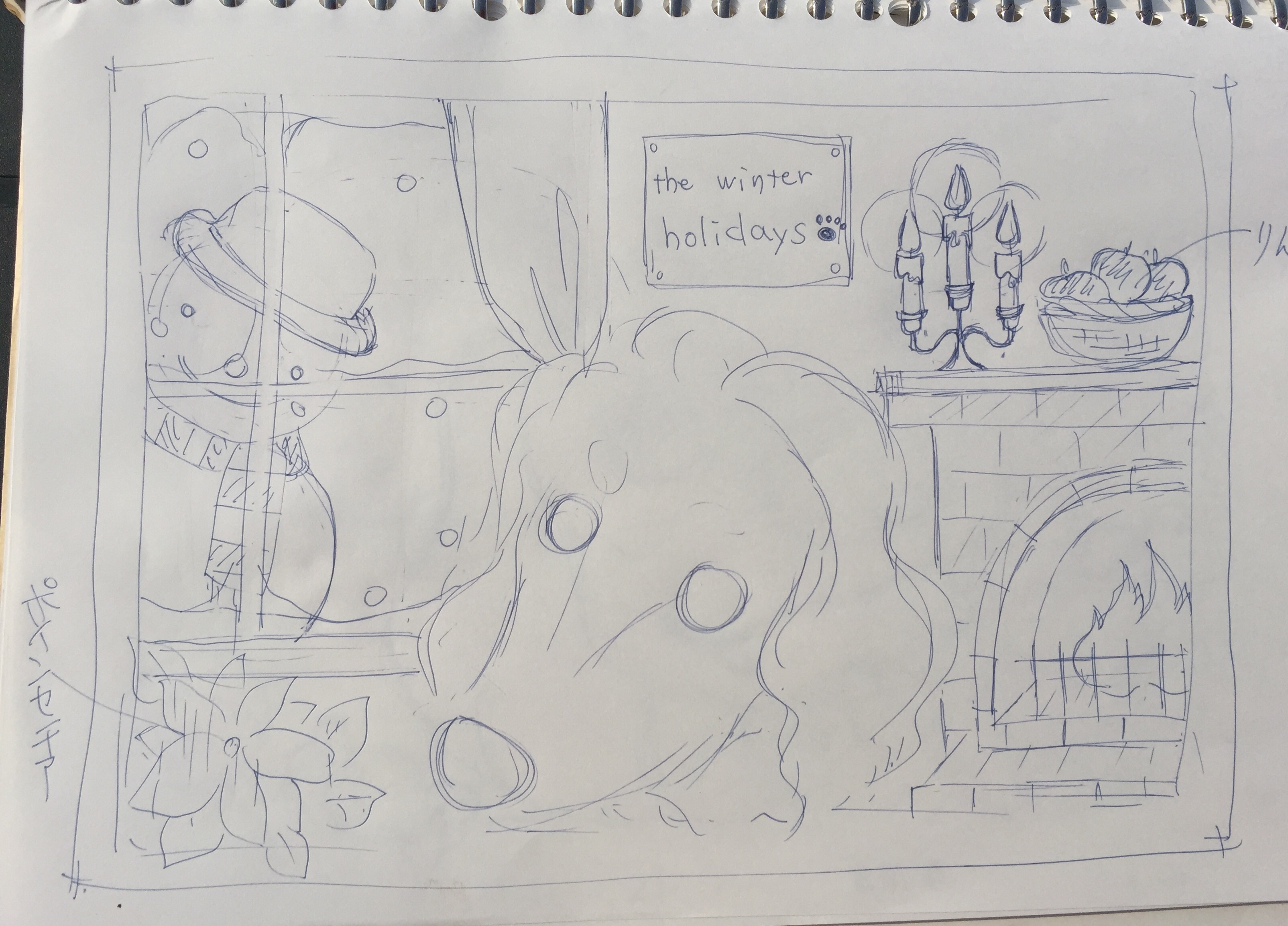 リクエストキーワードは「暖炉」「りんご」「窓から覗く雪だるま」でした。