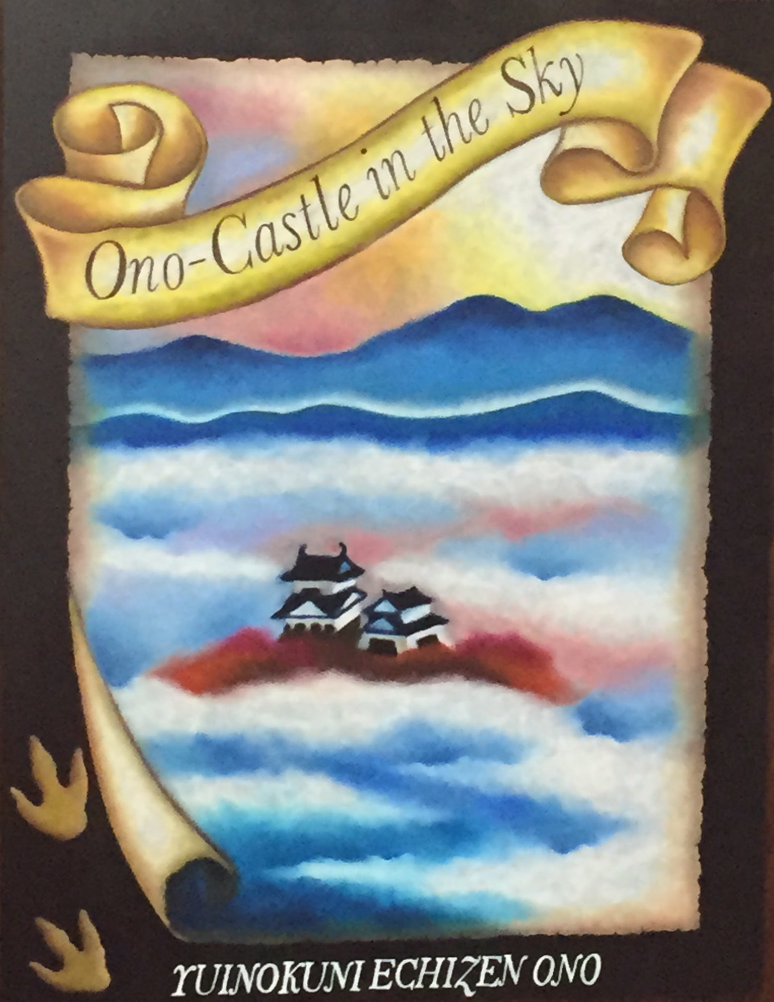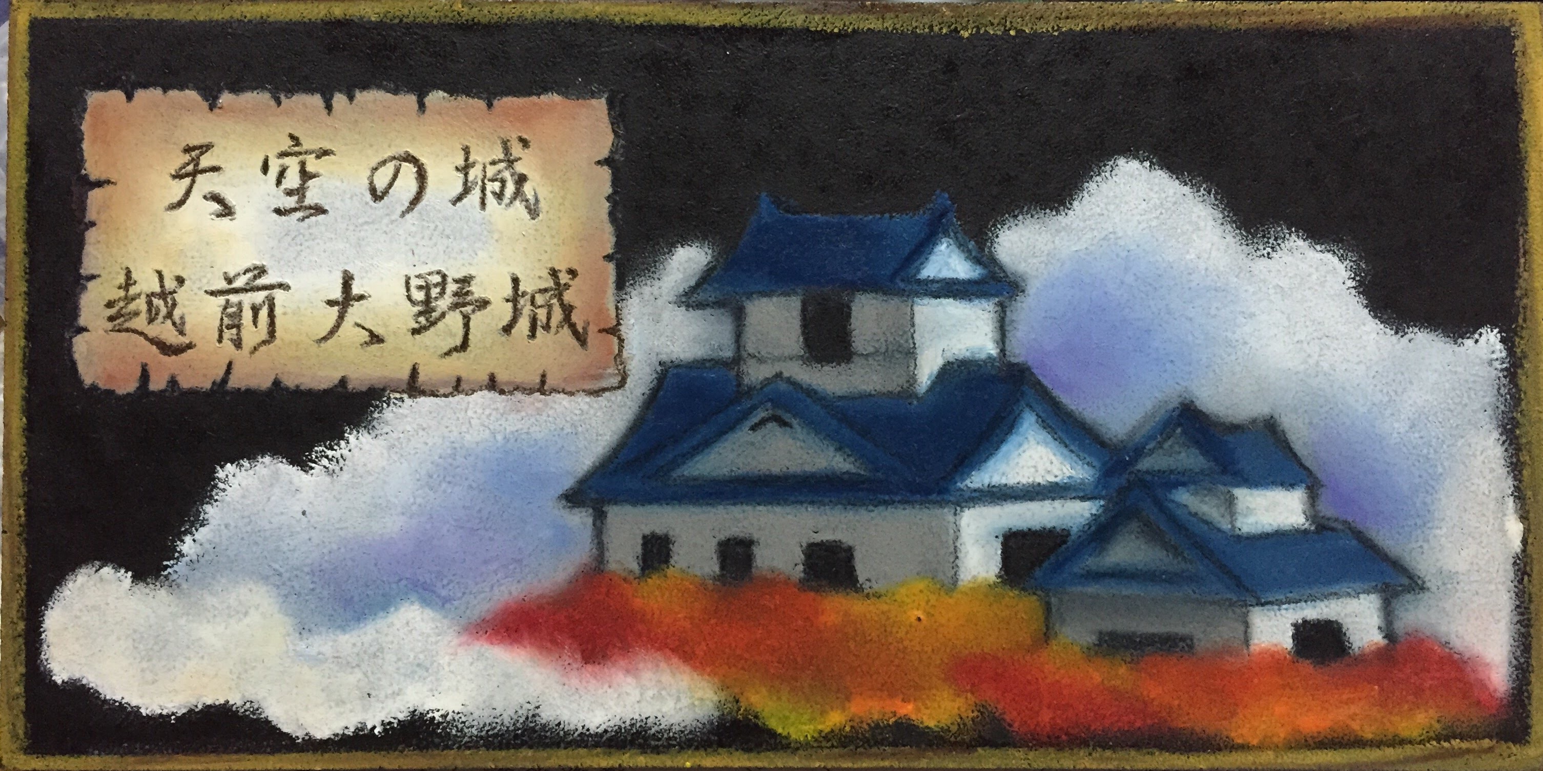 昨年描いたチョークアート工房もりのこりすの特大サイズのチョークアート作品「天空の城 越前大野城」。