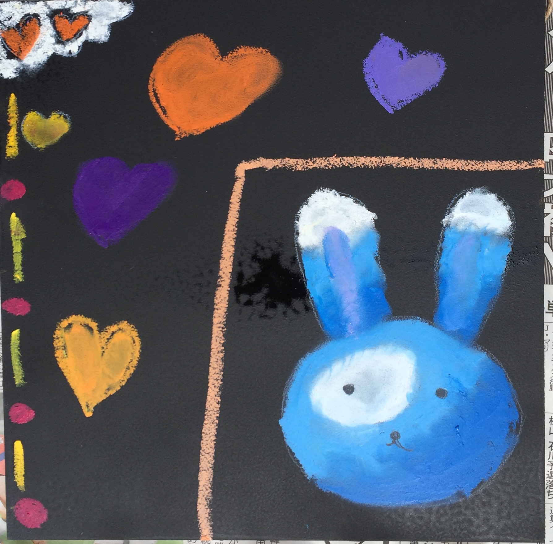 青色のうさぎちゃんボード。 カラフルなハートがウキウキしますね。