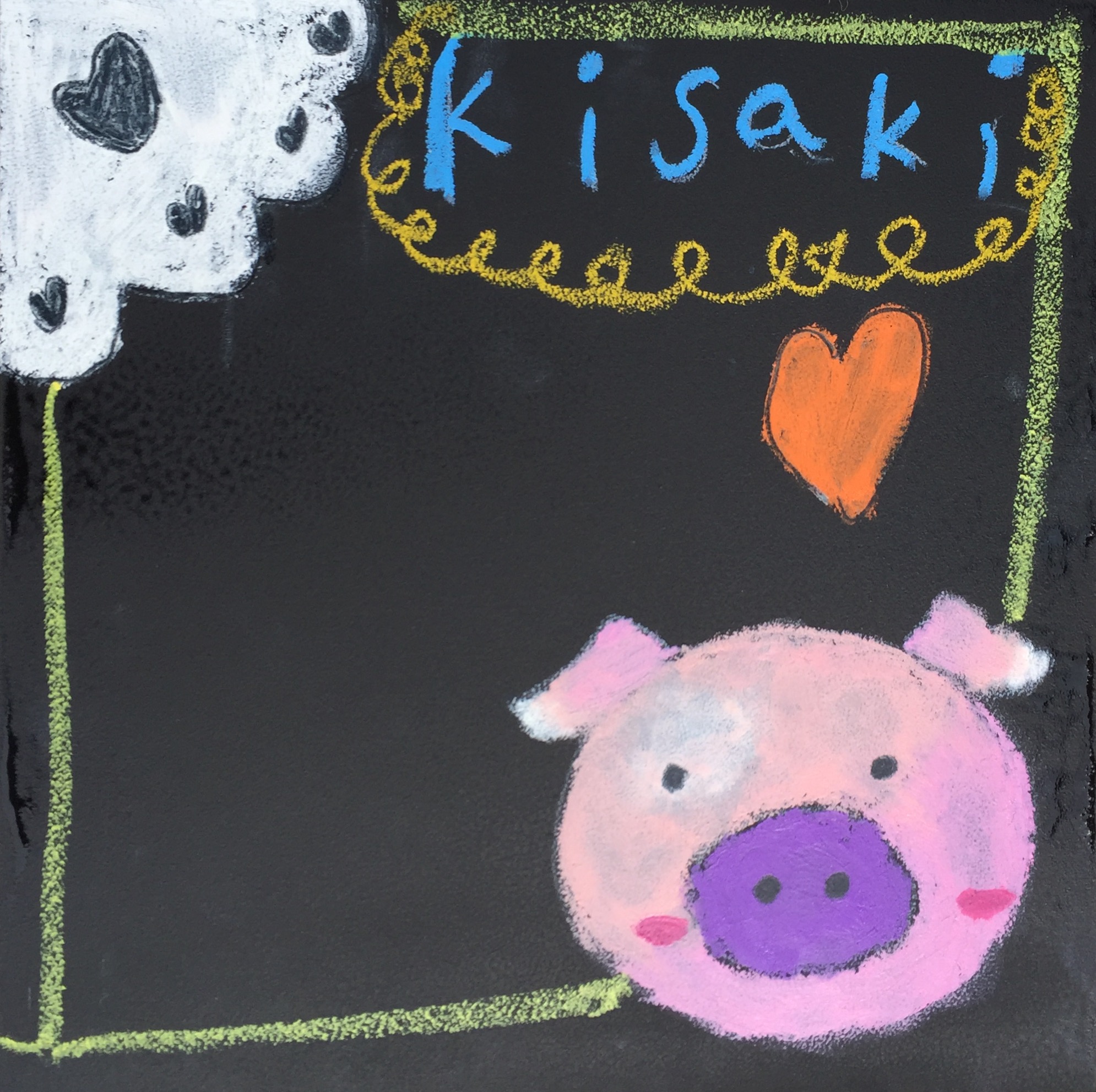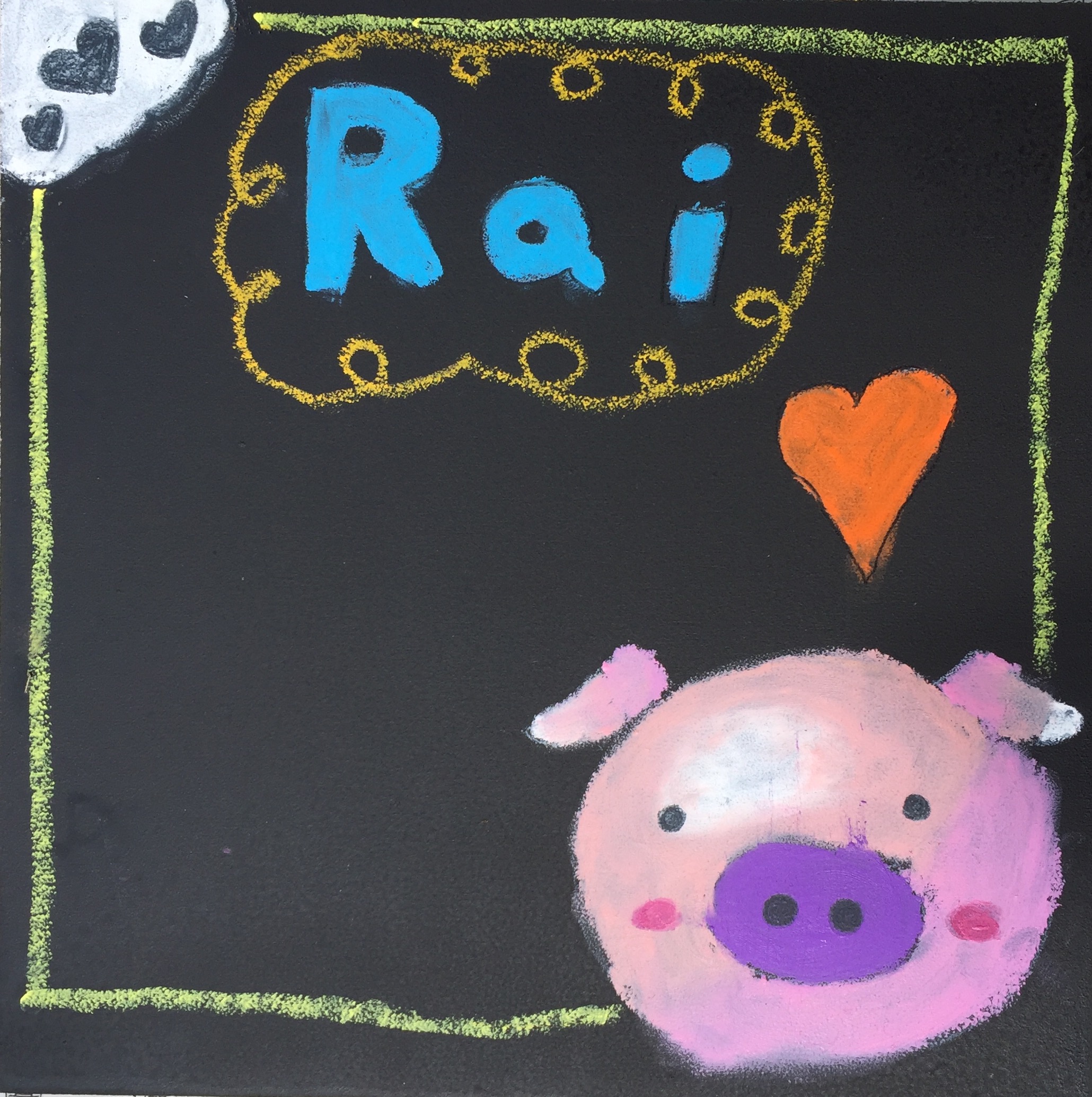 ピンクのブタちゃんボード。オレンジのハートが元気なボードです。