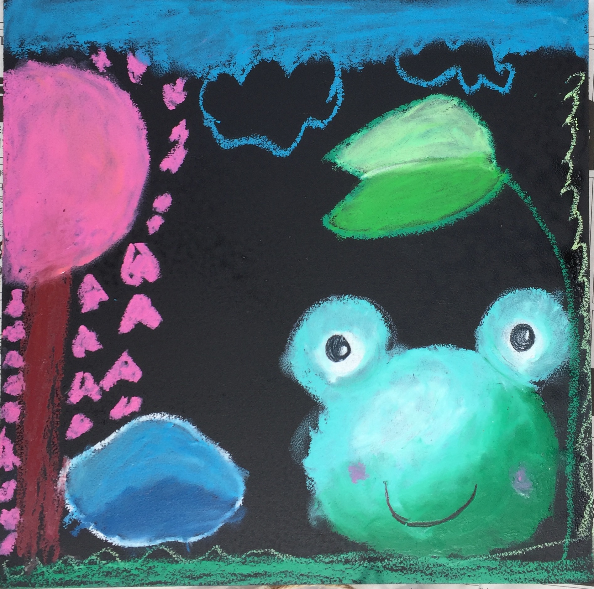 まん丸お目目のカエルちゃんボード。ピンク色の木は桜かな?嬉しそうなカエルちゃんボードに仕上がりました。